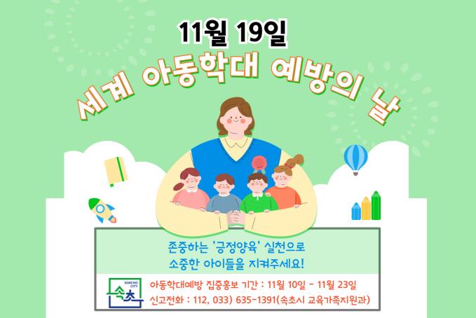 [뉴스노크=김인호 기자] 속초시는 11월 19일 ‘세계 아동학대 예방의 날’을 맞아 아동권리 존중 인식을 확산하고 지역사회 내 아동학대 예방 분위기를 조성하기 위해 11월 10일부터 23일까지 아동학대 예방 집중홍보 기간을 운영한다.
