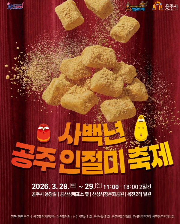 [뉴스노크=김인호 기자] 공주시는 오는 3월 28일부터 29일까지 이틀간 산성시장과 공산성 일원 등 왕도심에서 ‘2026년 사백년 공주 인절미축제’를 개최한다고 18일 밝혔다.