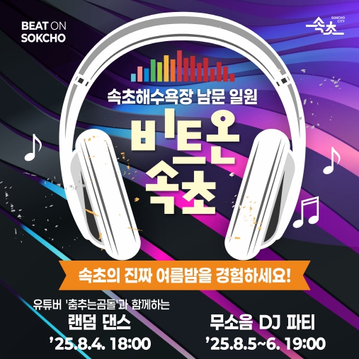 [뉴스노크=김인호 기자] 속초시는 여름 성수기를 맞아 새로운 형태의 참여형 야간축제 ‘비트 온(BEAT ON) 속초’를 오는 8월 4일부터 6일까지 3일간 속초해수욕장 남문 일원에서 개최한다.