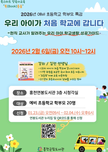 이번 교육은 2026년 예비 초등학교 학부모 특강 “우리 아이가 처음 학교에 갑니다”를 주제로, 2월 6일(금) 오전 10시 연봉도서관에서 진행된다.