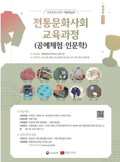 각 과정은 15명 이내의 소규모 정원제로 운영되며, 교육을 희망하는 국민 누구나 참여할 수 있다. 7월 28일부터 8월 10일까지 전통문화교육원 누리집에서 선착순 신청할 수 있으며, 과정별 세부 내용과 접수방법도 누리집에서 확인 가능하다.