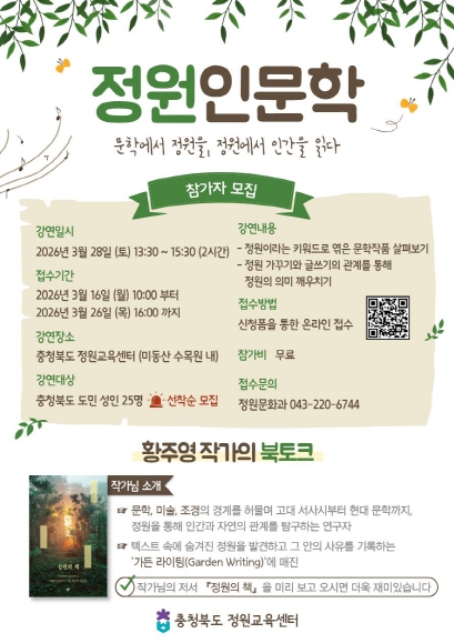 [뉴스노크=김인호 기자] 충청북도 정원교육센터가 정원을 매개로 한 신체적·정신적 활동과 인문학적 탐색을 통해 도민들의 생태 감수성을 함양하고 인문학적 정원 문화를 정착시키고자 ‘정원인문학(문학 속 정원 읽기)’ 교육을 운영한다.