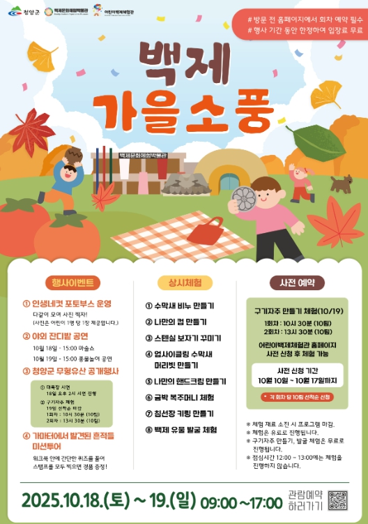 [뉴스노크=김인호 기자] 청양군은 오는 18일부터 19일까지 이틀간 백제문화체험박물관과 어린이백제체험관에서 ‘제5회 백제전통문화행사 백제 가을 소풍’을 개최한다.
