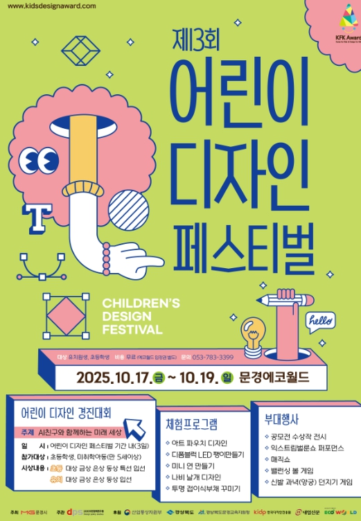 [뉴스노크=김인호 기자] 경상북도와 문경시가 주최하고 (사)디자인정책연구원이 주관하는 제13회 대한민국 어린이제품 디자인 공모전 ‘어린이 디자인 페스티벌’이 10월 17일부터 19일까지 사흘간 문경에코월드에서 열린다.