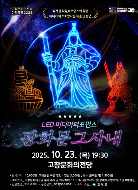 [뉴스노크=김인호 기자] 고창군문화의전당이 오는 23일 저녁 7시30분 ‘LED 미디어 퍼포먼스-광화문, 그 사내’ 공연을 무대에 올린다.
