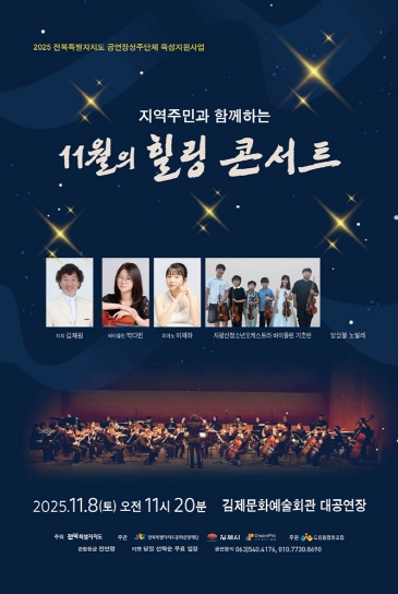 [뉴스노크=김인호 기자] 단순한 공연을 넘어 음악을 통해 세대와 지역이 함께 성장하고 소통하는 '지역주민과 함께하는 11월의 힐링 콘서트'가 오는 8일 오전 11시 20분 김제문화예술회관 대공연장에서 펼쳐진다.