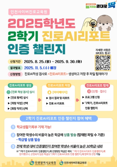 [뉴스노크=김인호 기자] 인천광역시교육청은 8월 25일부터 9월 30일까지관내 초·중·고등학생을 대상으로 ‘2학기 진로AI리포트 인증 챌린지’를 운영한다.
