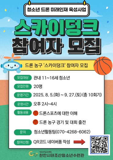 [뉴스노크=김인호 기자] (재)천안시청소년재단 천안시태조산청소년수련관은 드론 농구 프로그램 ‘스카이덩크’를 참가자를 모집한다고 30일 밝혔다.
