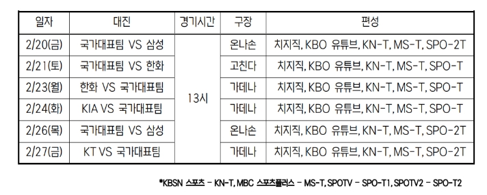 국가대표팀은 2월 20일(금) 삼성과의 경기를 시작으로 21일(토)과 23일(월)은 한화, 24일(화) KIA, 26일(목) 삼성, 27일(금) KT까지 4개팀과 총 6경기를 치른다. 이번 평가전은 3월초 오사카에서 열리는 WBC 공식 연습경기와 본 대회에 앞서 선수들이 페이스를 조절하고 컨디션을 끌어올릴 수 있는 기회를 마련하기 위해 기획됐다. 이번 평가전은 선수 보호와 컨디션 유지에 무게를 두고 있는 만큼 정규 이닝보다 단축해서 진행될 예정이며, 경기 이닝은 현장 상황에 따라 변동될 수 있다.
