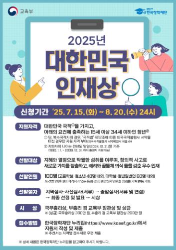 최경화 대학인재정책과장은 “지역 우수 인재 발굴을 통해 청년들이 역량을 발휘하고 성장할 수 있는 기회를 제공하겠다”며 “대한민국 인재상 선발을 계기로 지역 인재 육성에 대한 사회적 관심도 높아지길 기대한다”고 말했다.