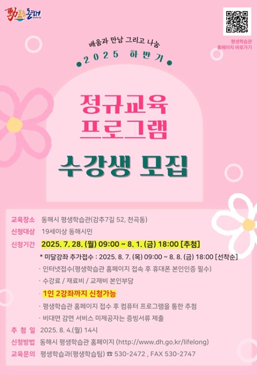 2025년 동해시 평생학습 하반기 정규교육 수강생 모집