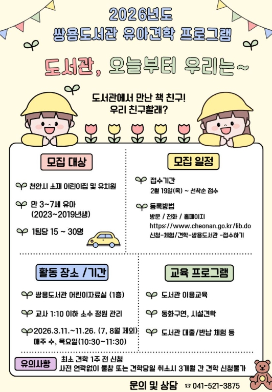 견학 신청은 전화·방문·천안시도서관 누리집을 통해 가능하며, 자세한 사항은 쌍용도서관으로 문의하면 된다.