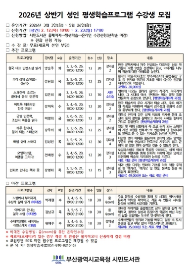 [뉴스노크=김인호 기자] 부산광역시립시민도서관(관장 이은경)은 3월부터 5월까지 유아, 어린이, 성인 등 560여 명을 대상으로 26개 평생학습프로그램을 운영한다. 프로그램은 전 연령층의 다양한 학습 수요를 반영해 구성했으며, 특히 어린이 대상 문해력·수리력 등 기초역량 강화 프로그램을 확대 운영한다.