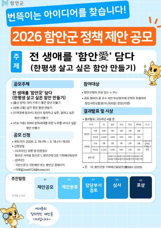 [뉴스노크=김인호 기자] 함안군은 지역 발전과 현안 해결을 위해 오는 2월 19일부터 3월 18일까지 ‘2026년 함안군 정책 제안 공모’를 실시한다고 13일 밝혔다.