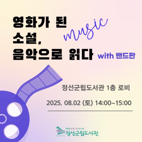 [뉴스노크=김인호 기자] 정선군립도서관이 오는 8월 2일 오후 2시, 도서관 1층 로비에서 영화음악 콘서트 ‘영화가 된 소설, 음악으로 읽다’를 개최한다.