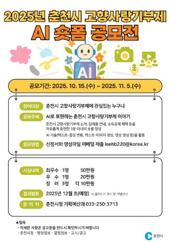 주제는 ‘AI로 표현하는 춘천시 고향사랑기부제 이야기’로 춘천시 고향사랑기부제에 관심있는 누구나 참여할 수 있다.