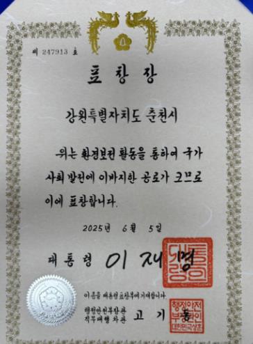 [뉴스노크=김인호 기자] 춘천시가 ‘2025년 환경보전 유공’ 대통령 표창을 받았다.