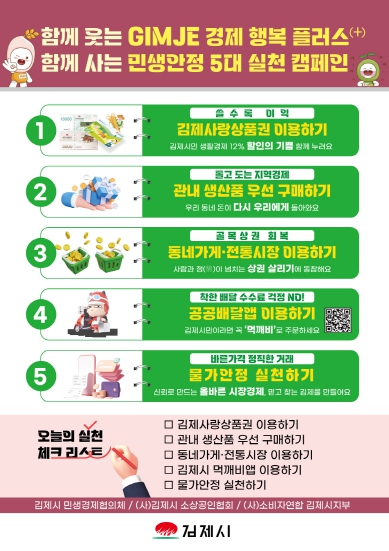 캠페인에서 제시된 주요 실천 항목은 ▲ 김제사랑상품권 이용하기 ▲ 관내 생산품 우선 구매하기 ▲ 동네가게·전통시장 이용하기 ▲ 공공배달앱 '먹깨비' 이용하기 ▲ 물가안정 실천하기 등으로, 지역 내 소비가 지역경제로 다시 환원되는 선순환 구조에 초점을 맞췄다.