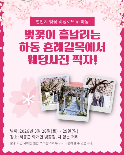 [뉴스노크=김인호 기자] 하동군은 오는 3월 27일부터 29일까지 열리는 ‘제27회 화개장터 벚꽃축제’를 앞두고, 특별한 웨딩 촬영 이벤트의 참가 신청을 받는다고 밝혔다.