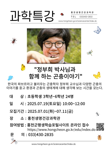 오는 7월 19일 홍천생명건강과학관 체험과학교실에서 개최되는 ‘정부희 박사와 함께하는 곤충이야기’ 강연은 어린이들의 과학적인 지식을 넓히는 것은 물론, 창의력을 키우고 자연에 대한 이해를 높일 기회를 제공한다.