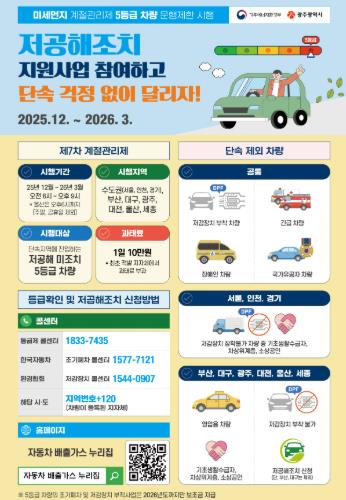 [뉴스노크=김인호 기자] 광주광역시는 12월1일부터 내년 3월31일까지 4개월간 ‘제7차 미세먼지 계절관리기간’으로 운영, 저공해 조치를 하지 않은 배출가스 5등급 차량의 운행을 제한한다.