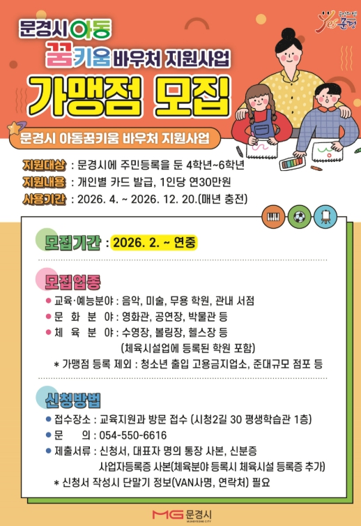 [뉴스노크=김인호 기자] 문경시가 지역 아동의 건강한 성장과 다양한 체험 활동 지원을 위해 추진하는 ‘아동꿈키움 바우처 지원사업’ 대상자 신청을 받고 있는 가운데, 오는 3월 17일까지 집중 접수 기간을 운영한다.