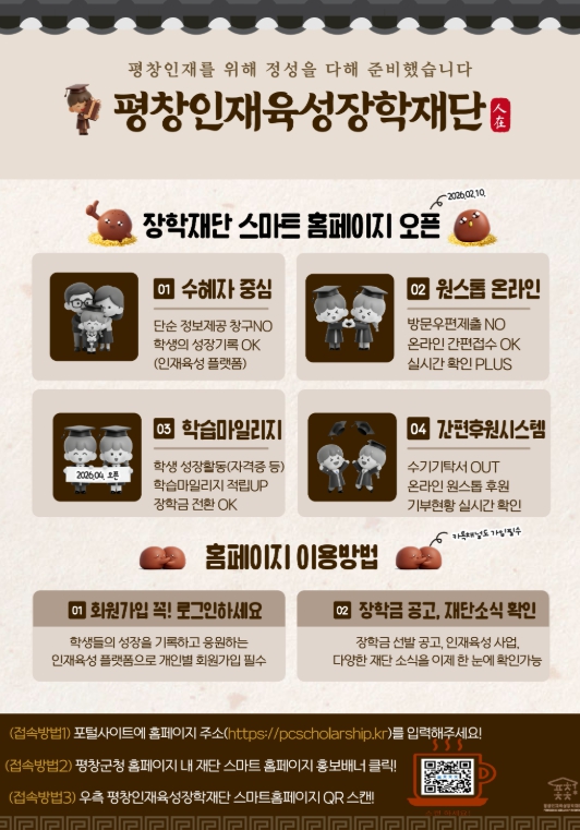 [뉴스노크=김인호 기자] (재)평창인재육성장학재단이 장학 행정의 효율성을 높이고 수요자 맞춤형 서비스를 제공하기 위해 10일 공식 홈페이지를 오픈하고 본격적인 운영에 들어간다.