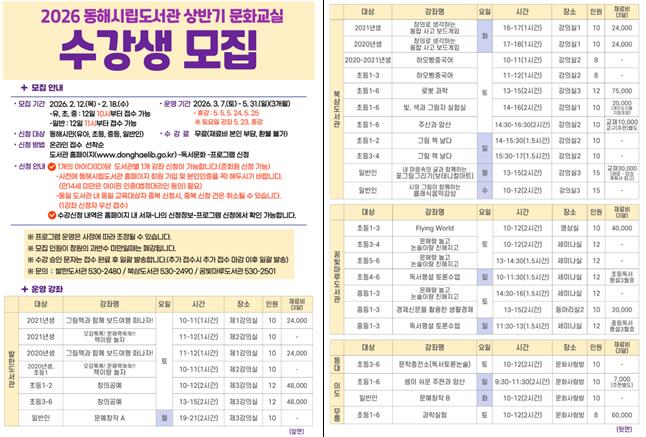 먼저, 동해시립도서관은 2026년 상반기 문화교실 수강생을 모집한다.