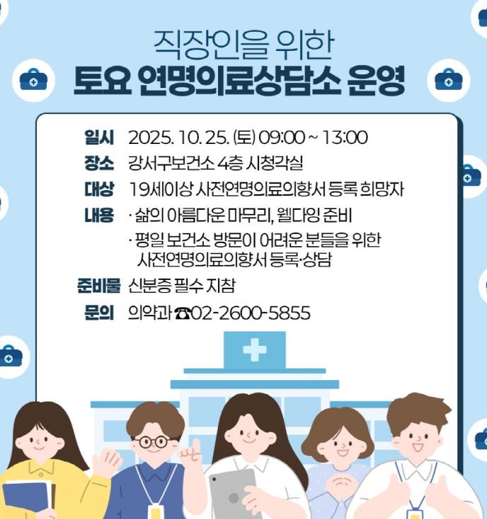[뉴스노크=김인호 기자] 서울 강서구는 평일 보건소 방문이 어려운 직장인과 주민들을 위해 ‘토요 연명의료상담소’를 운영한다.