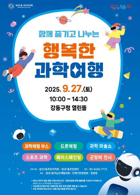 [뉴스노크=김인호 기자] 강동구 성내1동은 오는 27일 10시부터 14시 30분까지 강동구청 열린뜰에서 ‘제5회 함께 즐기고 나누는 행복한 과학여행’ 축제를 개최한다고 밝혔다.