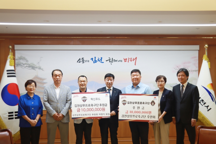 김천상무프로축구단이 8월 19일, 김천시청에서 김천상무 후원회의 후원금 전달식을 진행했다. 행사에는 김천상무 이재하 대표이사, 여영각 후원회장, 김경석 부회장, 신경원 감사, 최세은 이사, 이관영 사무국장, 최영순 재무가 참석했다.