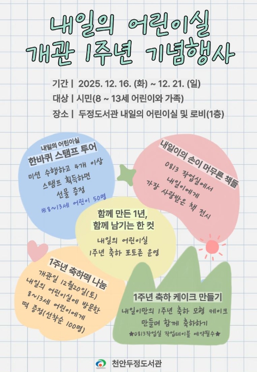 [뉴스노크=김인호 기자] 천안시 두정도서관은 오는 16~ 21일 ‘내일의 어린이실’ 개관 1주년 맞아 다채로운 기념행사를 운영한다고 15일 밝혔다.