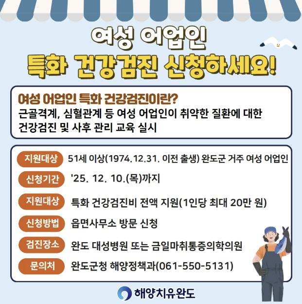 ▲ 완도군, 여성 어업인 건강검진비 전액 지원 |