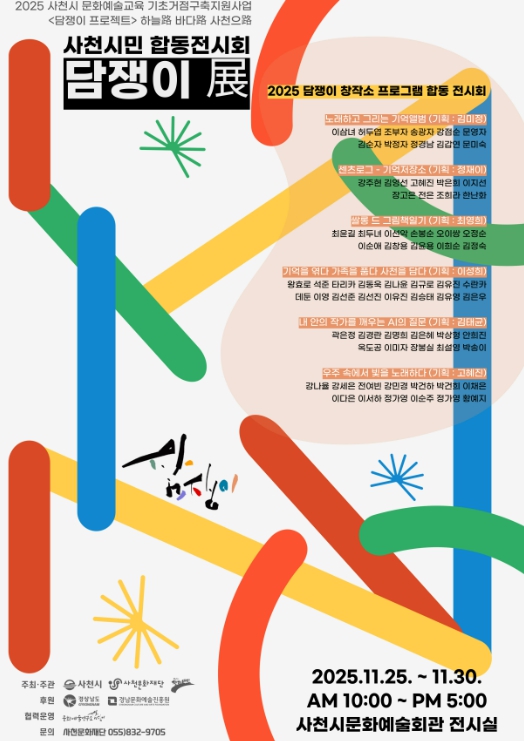 [뉴스노크=김인호 기자] 사천문화재단은 오는 11월 25일부터 11월 30일까지 2025 사천시문화예술회관 전시실에서 담쟁이 프로젝트 합동 전시회 '담쟁이 展'을 개최한다.