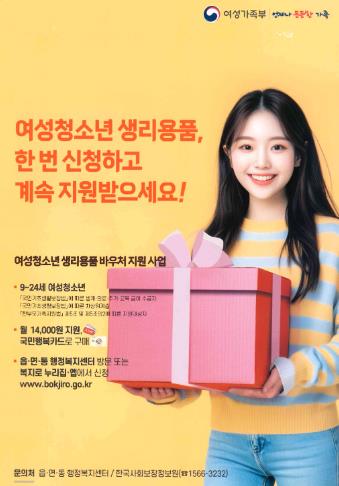 이 사업은 월 14,000원 상당의 바우처(국민행복카드 포인트)를 지급하여 생리대, 탐폰 등 필요한 생리용품을 구입할 수 있도록 지원하는 제도이다.