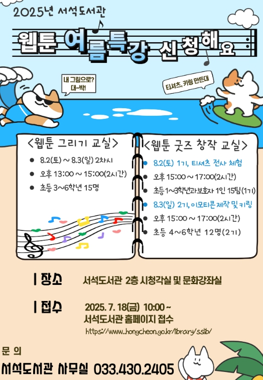 [뉴스노크=김인호 기자] 홍천 서석도서관은 여름방학을 맞이하여 오는 8월 2일과 3일에 어린이를 대상으로 “책과 함께하는 웹툰 창작교실” 여름 특강을 운영한다.