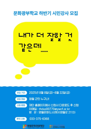 [뉴스노크=김인호 기자] (재)영월문화관광재단(대표이사 박상헌)은 법정 문화도시 조성사업의 목적으로 추진되는 '시민강사 프로젝트' 하반기 참여자를 8월 8일부터 22일까지 모집한다고 밝혔다.