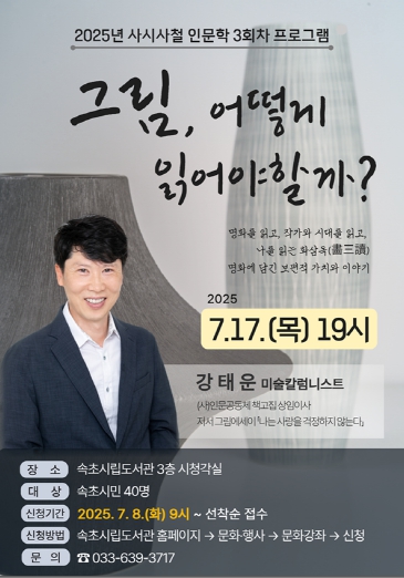 속초시립도서관 관계자는 “이번 특강은 명화를 매개로 삶의 깊이를 돌아볼 수 있는 소중한 시간이 될 것”이라고 전하며 많은 관심과 참여를 당부했다.