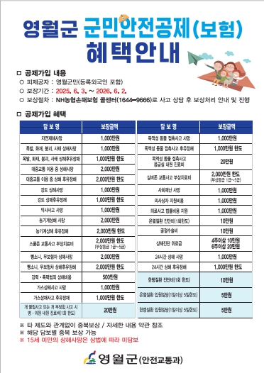 이번 보장 확대로 영월군은 기존의 상해·질병 보장에 더해 폭염이나 한파로 인한 온열·한랭질환 발생 시 진단비와 입원비를 지원하는 보장 항목을 신설했다.