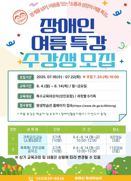 김은서 평생학습과장은 “장애인 부모님들의 여름방학 교육 고민을 깊이 이해한다”며, “이번 특강이 교육의 부담을 덜고, 장애 가족들의 돌봄 부담을 줄이는 작은 힘이 되길 바란다”고 진심을 전했다.