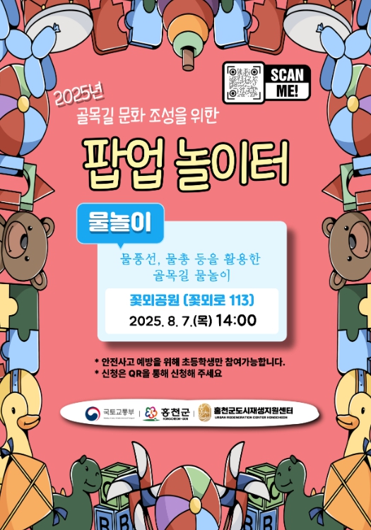 [뉴스노크=김인호 기자] 홍천군은 오는 8월 7일 꽃뫼공원에서 어린이들을 위한 물풍선 및 물총놀이 프로그램 ‘팝업 물놀이터’를 운영한다고 밝혔다.