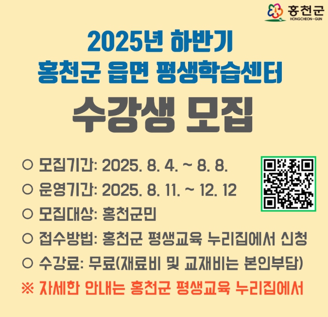 [뉴스노크=김인호 기자] 홍천군은 8월 7일부터 8월 8일까지 [2025년 하반기 홍천군 읍・면 평생학습센터] 프로그램 수강생 모집을 실시한다.