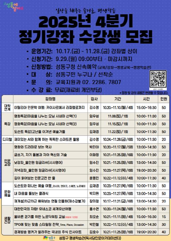 [뉴스노크=김인호 기자] 서울 성동구가 2025년 4분기 평생학습관 정기강좌 수강생을 오는 9월 29일(월) 오전 9시부터 성동구청 누리집(홈페이지) 신속예약에서 선착순으로 모집한다.