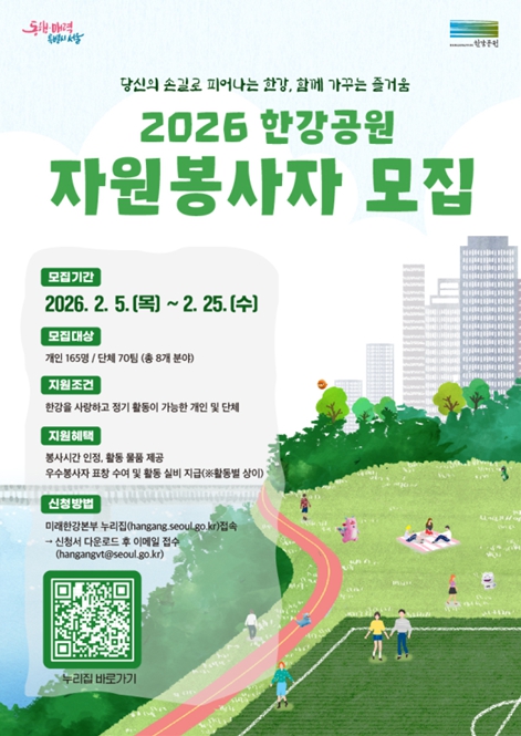 [뉴스노크=김인호 기자] 서울시 미래한강본부가 시민의 손길로 한강의 가치를 피워내고 함께 가꾸는 즐거움을 공유할 ‘2026년 한강공원 정기 자원봉사자’를 모집한다. 접수 기간은 2월 5일부터 2월 25일까지 약 3주 간이다.