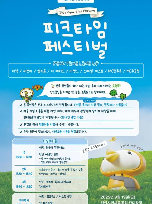 [뉴스노크=김인호 기자] 전국청년축제 ‘2025 피크타임 페스티벌’이 오는 19일 천안시민체육공원 잔디광장 일원에서 열린다.