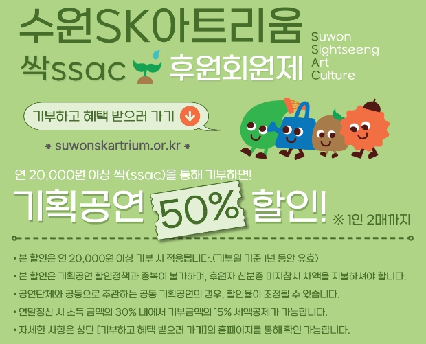 [뉴스노크=김인호 기자] 수원문화재단은 문화예술 기부 프로젝트‘싹(ssac)’의 활성화를 위해 수원SK아트리움 이용 관객을 대상으로‘싹(ssac) 후원회원제’를 시행한다.