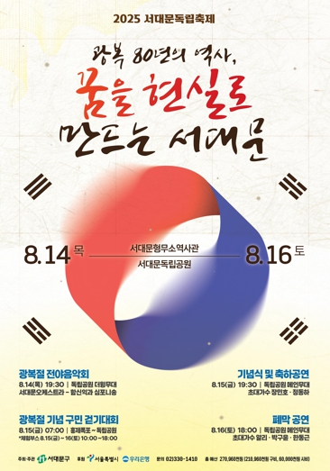 이성헌 구청장은 “뜻깊은 광복 80주년을 맞아 꿈을 현실로 만드는 서대문구와 함께 광복의 의미를 되새기고 우리 역사에 대한 자긍심을 나누는 소통과 공감의 축제가 될 것으로 기대한다”고 말했다.