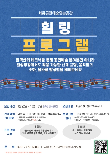 이어 ‘힐링 프로그램’은 10월 16일과 23일 양일간 운영된다. 예술인과 일반인 15명을 대상으로 한국 알렉산더테크닉협회 전문 강사가 진행하는 바른 자세와 호흡법을 통한 신체 활용 개선법을 배워본다. ‘알렉산더 테크닉’은 국내 다수 예술학교와 공연단체에서 채택하고 있는 교육과정으로, 참가자들에게 예술활동에 필요한 신체적 역량 강화 기회를 마련할 예정이다. 프로그램 종료 후에는 참가자 간 네트워킹 시간도 마련해 교류와 협업의 장을 제공한다.