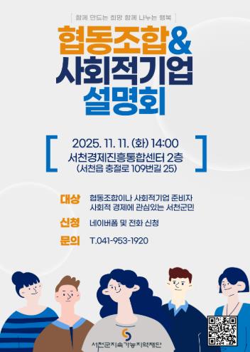 [뉴스노크=김인호 기자] (재)서천군지속가능지역재단은 오는 10월 20일 오후 2시, 서천경제진흥통합센터에서 ‘협동조합·사회적기업 설명회’를 연다.