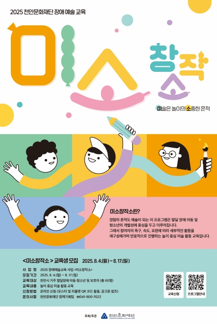 [뉴스노크=김인호 기자] 천안문화재단은 오는 8월 17일까지 발달장애 아동을 위한 예술교육 프로그램 ‘미소창작소’의 참가자를 모집한다고 4일 밝혔다.